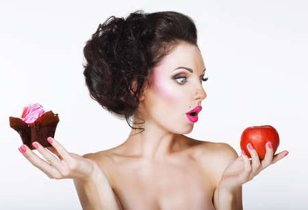 Diet. Dieting concept. Healthy useful food. Beautiful young women choosing between fruits and unhelathy cake at studio. Human emotions and comparison concepts