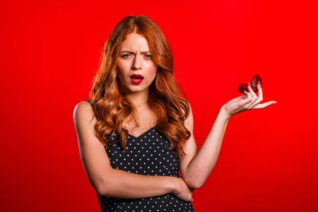 Pretty european young woman in polka dot dress holding small jewelry box with marriage proposal on red background. Disappointed upset girl, she doesnt like gift.