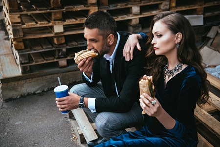 side view of couple in luxury clothing with hot dogs and soda drink sitting on wooden pallet on street