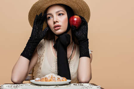 Stylish woman in gloves holding apple near croissant isolated on beige