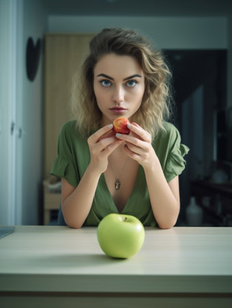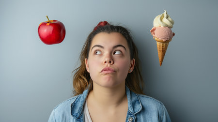 A young woman contemplates between an apple and an ice cream cone with a thoughtful expression