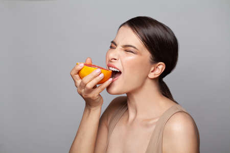 Vitamin C concept. Dark skinned woman with fruits lemon. Energy from fruits.