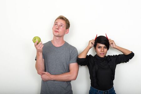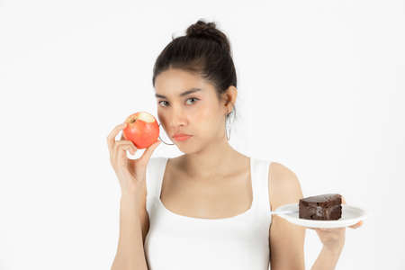 Upset stressed Asian woman choosing between apple fruit or unhealthy cake on hands over white isolated background. Healthy lifestyle and dieting concept.