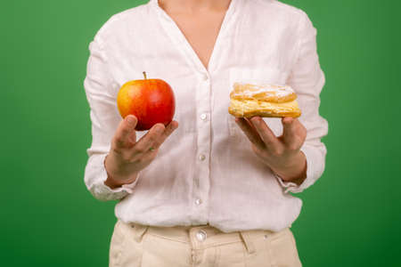 A middle-aged woman in a white shirt holds an apple and a cake on a green background. The concept of choosing the right healthy food.