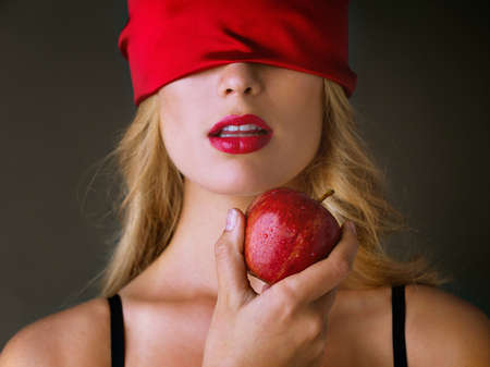 Tonight, its all about taste. Studio shot of a blindfolded young woman eating a red apple suggestively against a dark background.