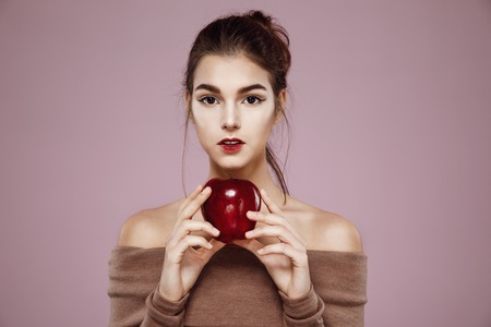 Pretty young girl holding red apple in hands looking at camera. Copy space.