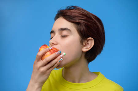 Close up portrait of pretty teenage girl biting an apple on blue background