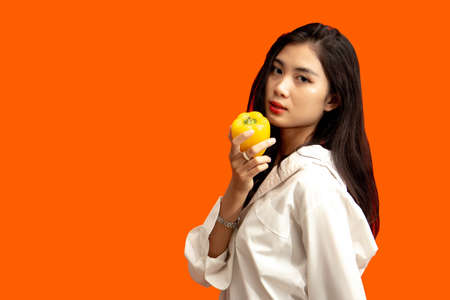Vegetarian concept, Healthy woman eating yellow bell pepper standing in isolated orange background.
