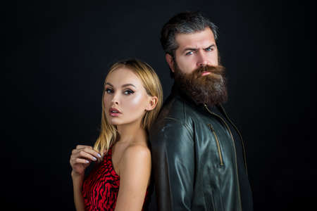 Handsome bearded businessman. Couple in elegant evening dresses. Sexy male, brutal macho, hipster.