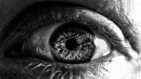 Expressive strong look - closeup of an eye looking sad and empty, high contrast black and white shot