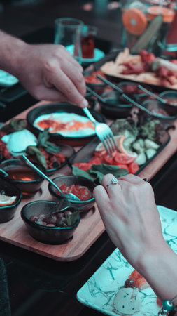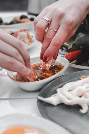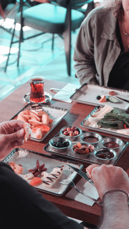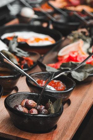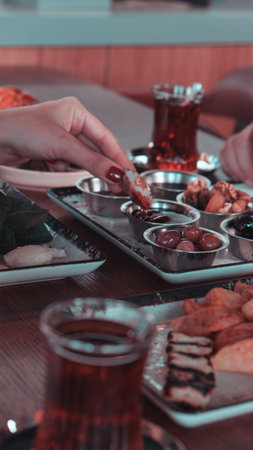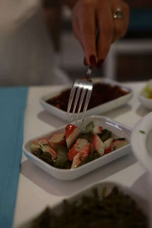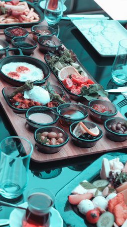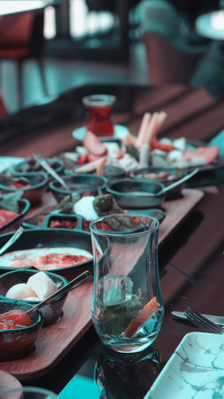 traditional turkish appetizers on table in evening sun light. Close-up, shallow depth of field.