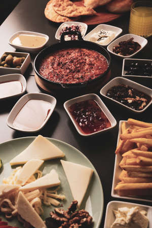 Top view traditional Turkish and Greek dinner appetizer table. Mediterranean appetizer concept. Raw meatballs, roasted eggplant salad, stuffed olives, stuffed peppers, gavurdagi salad