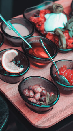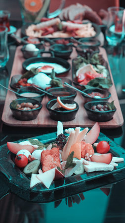 A beautiful arrangement of assorted small plates featuring a variety of appetizers, perfect for gatherings and sharing. Fresh ingredients and vibrant colors create an inviting dining experience.