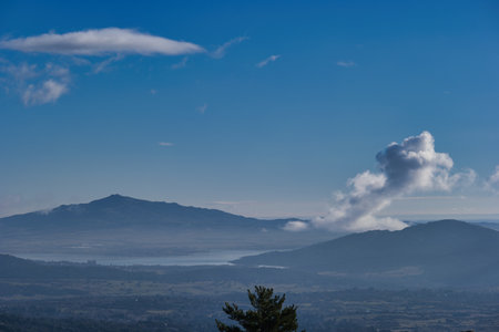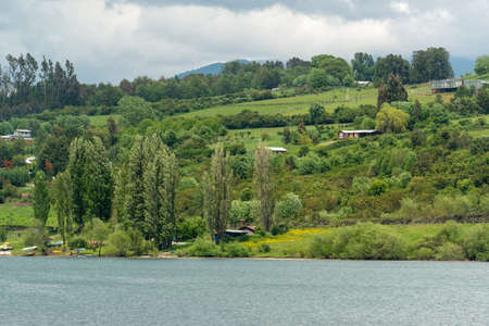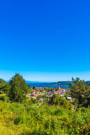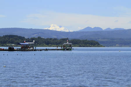 View of the mountain landscape and the lake, Puerto Montt, Chile. Copy space for text