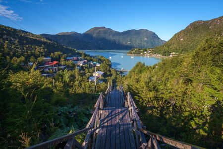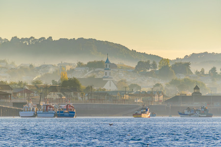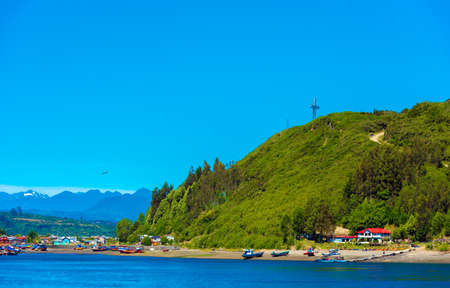 CHILOE, CHILE - SEPTEMBER, 27, 2018: Beautiful outdoor view of wooden house buildigs in the horizont of chonchi harbour in Chiloe island Chile