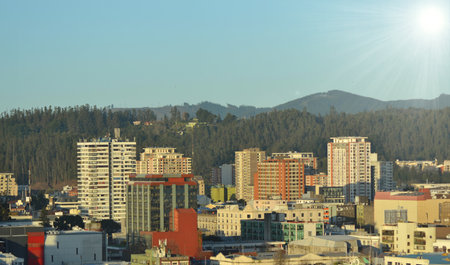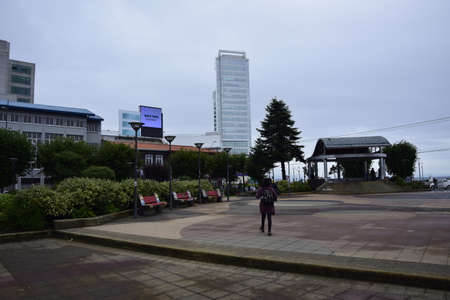 VALDIVIA, CHILE - FEBRUARY 3, 2016: Hotel Dreams Pedro de Valdivia and the riverside promenade in the city center photographed from Pedro de Valdivia bridge on February 3, 2016 in Valdivia, Chile. Valdivia is a popular tourist destination in Chile.