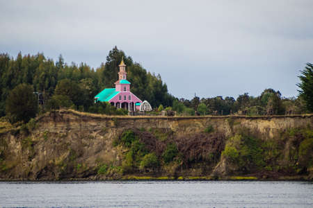 Tipical wood made church in Chiloe island, Chile. Patagonia, view crossing the channel patagonia