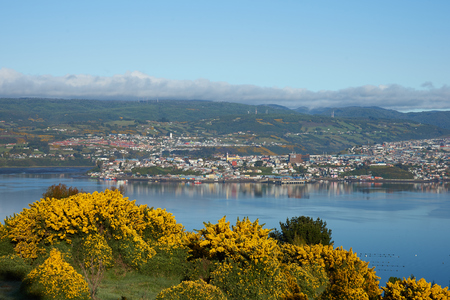 Castro, the capital of Chiloe Island in Chile. Small city located on the far coast of a sheltered inlet. Viewed over yellow flowering gorse bushes.