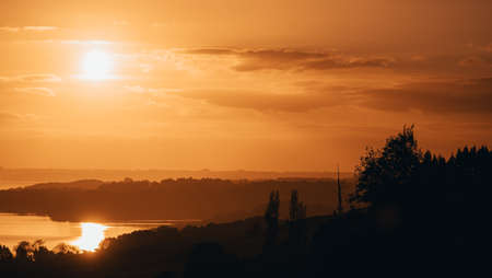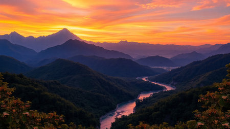Early dawn sun flare over mountains with clouds and fog creating dreamy golden light in tranquil wilderness