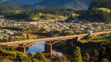 Aerial view of a spectacular waterfall in New Zealand, with Christian Kober's signature vapor rising from the turquoise waters, showcasing its power and beauty. The water is blue with white foam as it cascades down over lush greenery. In the background, people can be seen on a footbridge or along the river bank, adding to the sense that they are marveling at the scene. This aerial shot captures the overall scenery, including the surrounding forest, sky, and a road for a zoom-out effect. --chaos 30 --ar 16:9 --quality 2 --stylize 500 --v 6.1 Job ID: 56f06186-8de5-4789-8807-5f5eb4b56aec