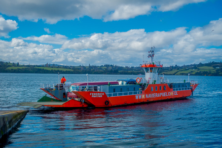 CHILOE, CHILE - SEPTEMBER, 27, 2018: Outdoor view of small red ferry with some cars boarding in the chonchi harbour in Chiloe island Chile
