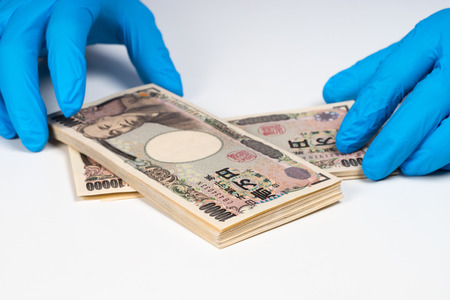 Ten thousand japanese yen bills and magnifying glass
