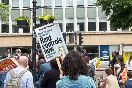 Bristol, UK - June 10, 2017: A protester holds a placard calling for rent controls at a demonstration against government policies