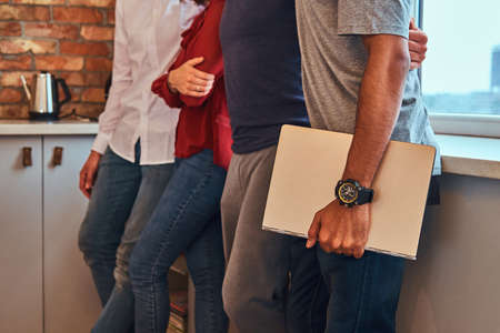 Cropped photo of a group of interracial students with laptop in a student dormitory.