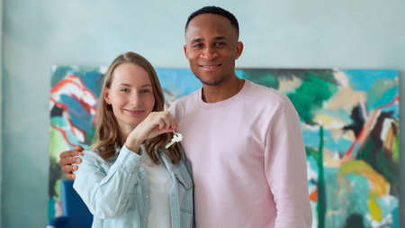 Young, happy African American woman holding house keys and hugging boyfriend in her new apartment after buying real estate. Moving to a new house, housewarming, housewarming in a new house, loan or leasing from a bank, real estate, for commercial use