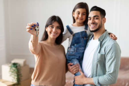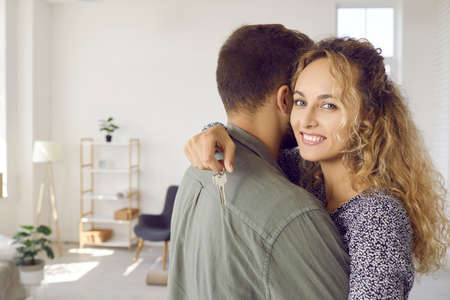 New home new life. Young woman holding keys hugging husband in their new home after buying real estate. Close up of woman in arms of her husband holding key house of her dreams and looking at camera