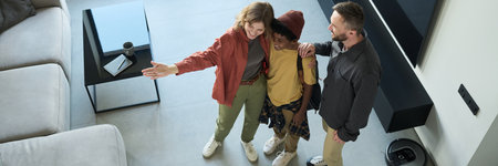 Group of friends standing together in contemporary living room. Modern furniture and clean design elements surrounding happy individuals enjoying each others company