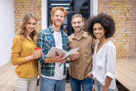 A group of confident young people standing together, smiling warmly at the camera, showcasing friendship and camaraderie.