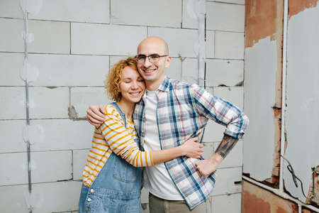 Portrait of a couple in love inside an apartment under construction. Hugging each other, her eyes closed.