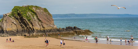 People at the beach in Tenby, an ancient walled town; now a tourist destination in the county of Pembrokeshire, south Wales, UK.