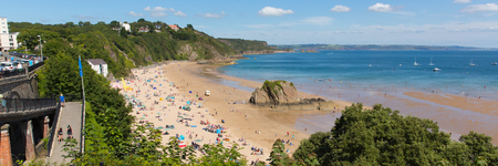 Tenby Pembrokeshire Wales uk north beach in summer with tourists and visitors and blue sky panorama