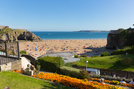 Tenby Pembrokeshire Wales uk castle beach in summer with tourists and visitors and blue sky