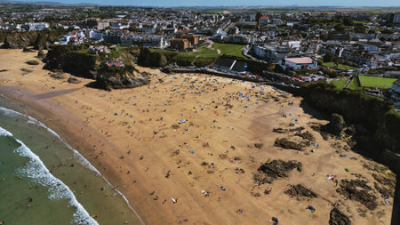 Aerial view of a beach with golden sand and people sunbathing and swimming. In the background, a town with buildings and greenery is visible. The ocean waves gently lap at the shore, creating a serene coastal scene.