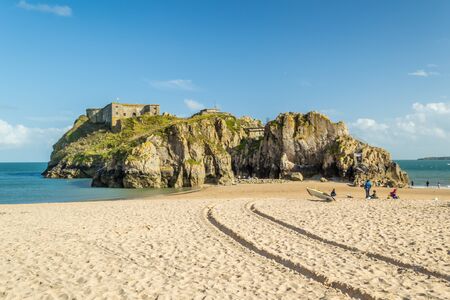 Tenby, Wales - August 12, 2017: People enjoying their time at Tenby Castle ruins and the sandy beach view at low tide during summer in Tenby, Wales.