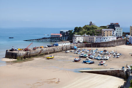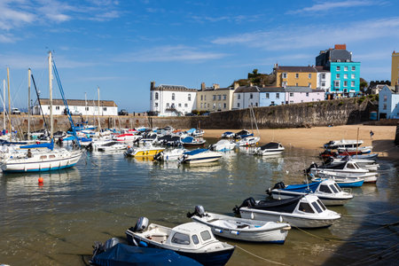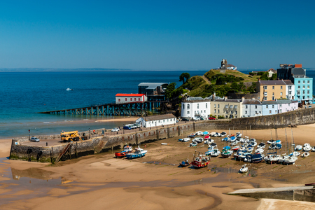 Tenby Harbour, Pembrokeshire, Wales, the United Kingdom. Boats on the beach at low tide. Colorful buildings of popular Welsh resort on a sunny Summer day. Tenby, UK - September 20, 2021