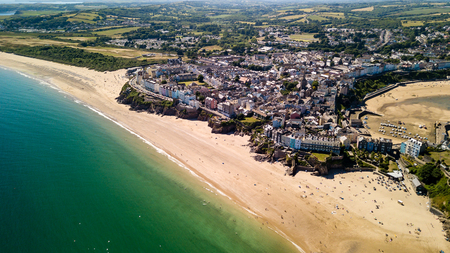 Aerial drone view of the picturesque and colorful Welsh seaside town of Tenby