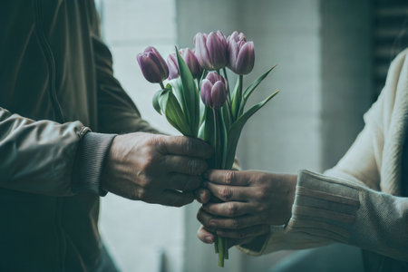 Close-up of a couple gently exchanging a bouquet of purple tulips outdoors. Romantic and tender moment.
