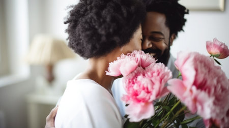 African couple in love with a bouquet of pink peonies, blurred white living room.