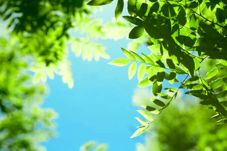 Close Up green leaf under sunlight in the garden. Natural background with copy space.