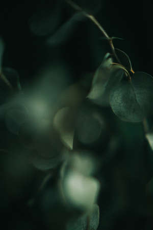 Branch of eucalyptus on dark green background, gloomy photo of the plant
