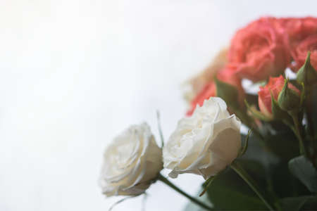 Bouquet of pink and white roses on a light background.
