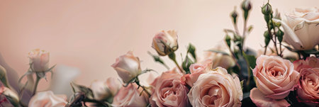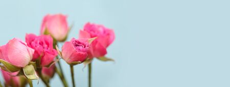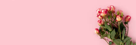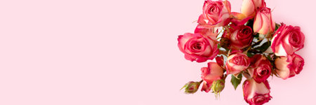 Header with bouquet of rose flowers on a pink background. Present for Mothers Day. Festive concept with place for text.