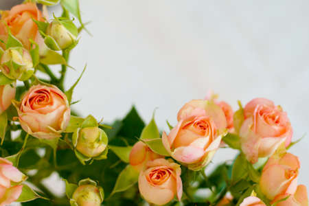 Delicate pastel roses close-up on a blurry light background. A fragrant bouquet of peach roses. Gift for birthday, wedding, Valentine's Day, Mother's Day. Soft focus, diffused light, copy space