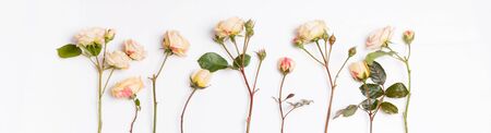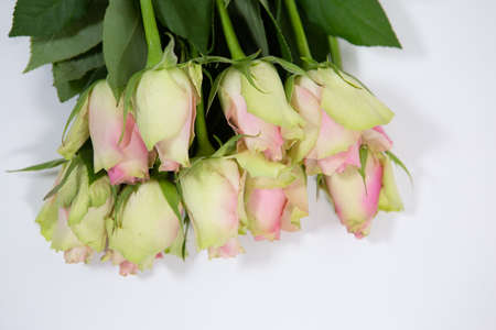 Pink or green Roses in row, isolated on white background. Greenting background with copy space.