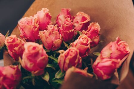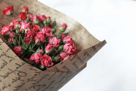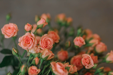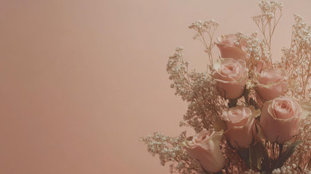Romantic bouquet of pink roses and babys breath in vintage-style wrapping on a peach-pink background