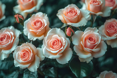 Peach roses in full bloom amidst lush green leaves create a serene garden scene. the soft, delicate petals of the flowers are beautifully highlighted, showcasing their intricate natural beauty perfect for romantic or nature-themed designs. Generative AI